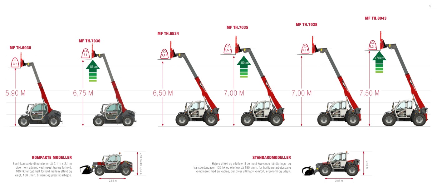 Der kan vælges mellem seks modeller fra den semikompakte MF TH.6030 og til den nyeste MF TH.8043, der har en maksimal løftekapacitet på 4.300 kg og en højde på 7,5 m, og som kan udstyres med en skovl med en kapacitet på 3.500 liter.