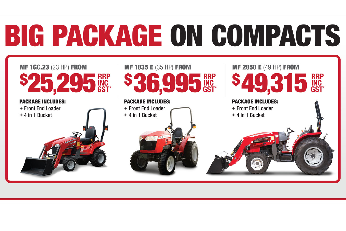 *Offer and advertised pricing are valid for new retail orders placed between 1st November 2025 and close of business on 28th February 2026, and for units delivered by 31st March 2026, or while stock lasts (whichever occurs first). Pricing is based on a standard specification tractor with loader and 4-in-1 bucket; all additional items and accessories are sold separately. Not available in conjunction with any other offer or discount. Images are for illustration purposes only and may differ from machines available in-country. Pre-delivery and freight charges may apply. ~Eligible purchases will receive one complimentary Weber® Baby Q® Red 1200N LPG, with estimated dispatch within one month of machine delivery. This offer applies only to the purchase of Massey Ferguson MF 1 GC Series, MF 1800 Series, or MF 2800 Series tractors. Available from participating Massey Ferguson dealers only, while stock lasts. ^4-year warranty includes a standard 2-year / 2,000-hour warranty plus an extended 2-year term (total warranty: 4-years / 2,000 hours), subject to exclusions and an excess during the extended warranty period. Contact your local Massey Ferguson dealer for full details.