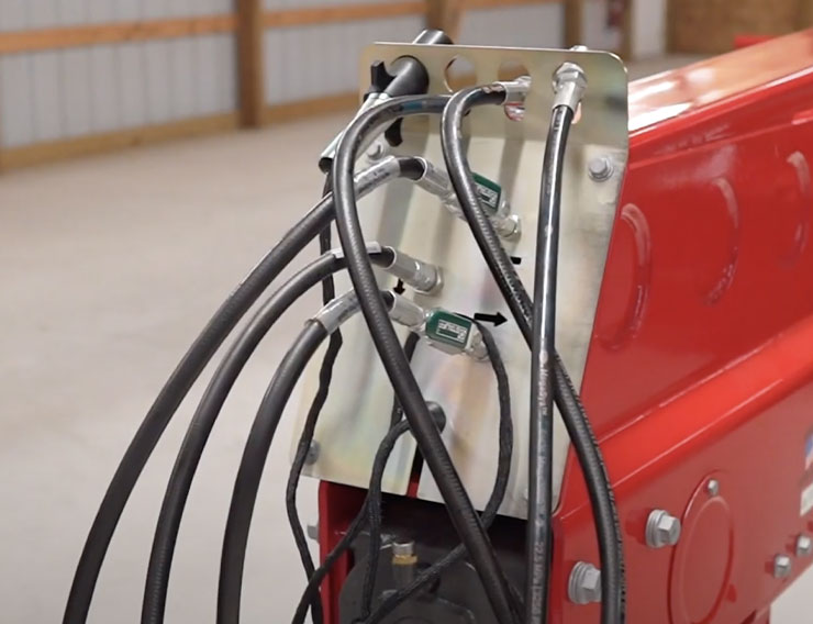 Conditioner rolls are tensioned hydraulically by an industry-exclusive system to provide even and consistent pressure on both sides of the top conditioner roll. The system bleeds the lift circuit pressure with a needle valve to set the desired pressure.