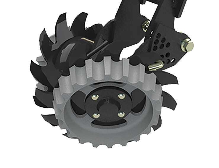 Thirteen-inch (330-millimeter) SharkTooth or finger wheels and depth bands provide aggressive residue movement from the path of the row unit. The unit-mounted residue wheels float over the surface, and the depth bands assure the right depth of operation.