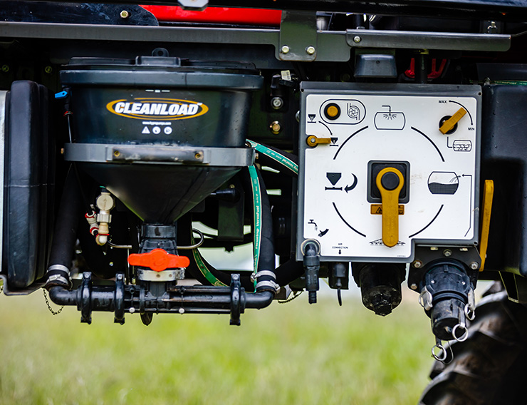 The filling station of the sprayer is simple to understand and operate. It Features include: 2” and 3” cam lock fill point, 568 l/min reload pump, Unload point, 26.5 litre Hypro chemical hopper, adjustable agitation rate, Fresh water pump on/off.