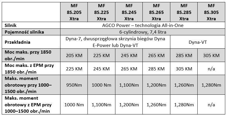 Seria MF 8S Xtra – specyfikacje gamy