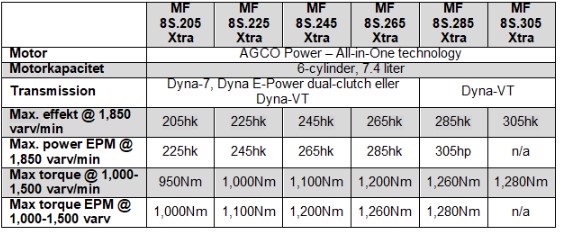 MF 8S Xtra-serien – specifikationer för modellutbudet