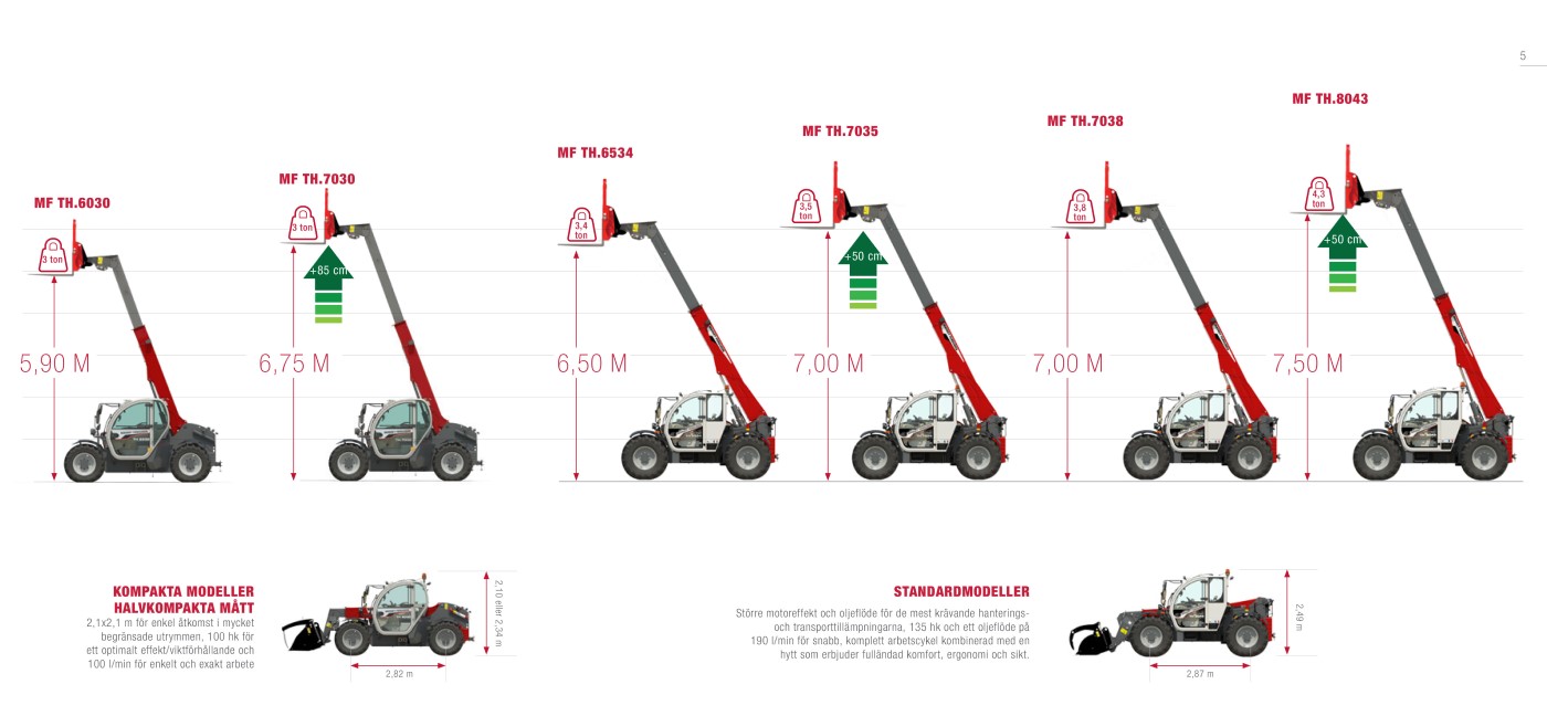 Sparsamma mått på 2,1 m i bredd x 2,1 m i höjd ger de semikompakta modellerna MF TH.6030 och MF TH.7030 enkel åtkomst till de mest begränsade utrymmena. Med motorer på 100 hk och ett hydraulflöde på 100 l/min klarar de att lyfta laster på upp till 3 000 kg till 5,9 m eller 6,75 m.