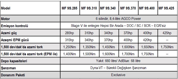 MF 9S Serisi 285hp'den 425hp'ye kadar güçler sunar. Massey Ferguson'un benzersiz Protect-U tasarımının yanı sıra tüm modeller, performansı ve üretkenliği artırmak için gelişmiş bir motor tasarımı ve güncellenmiş Dyna-VT şanzımanla donatılmıştır.